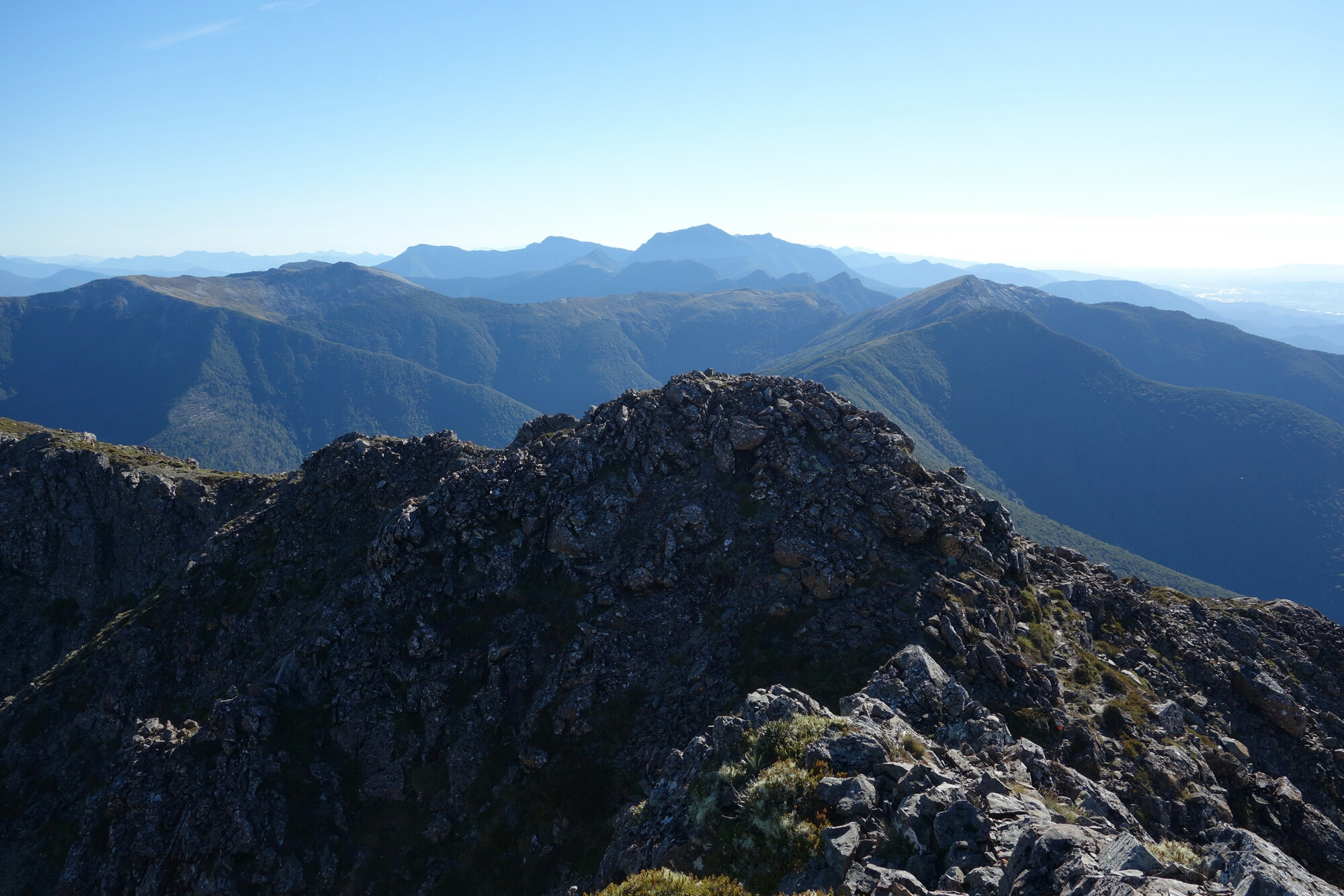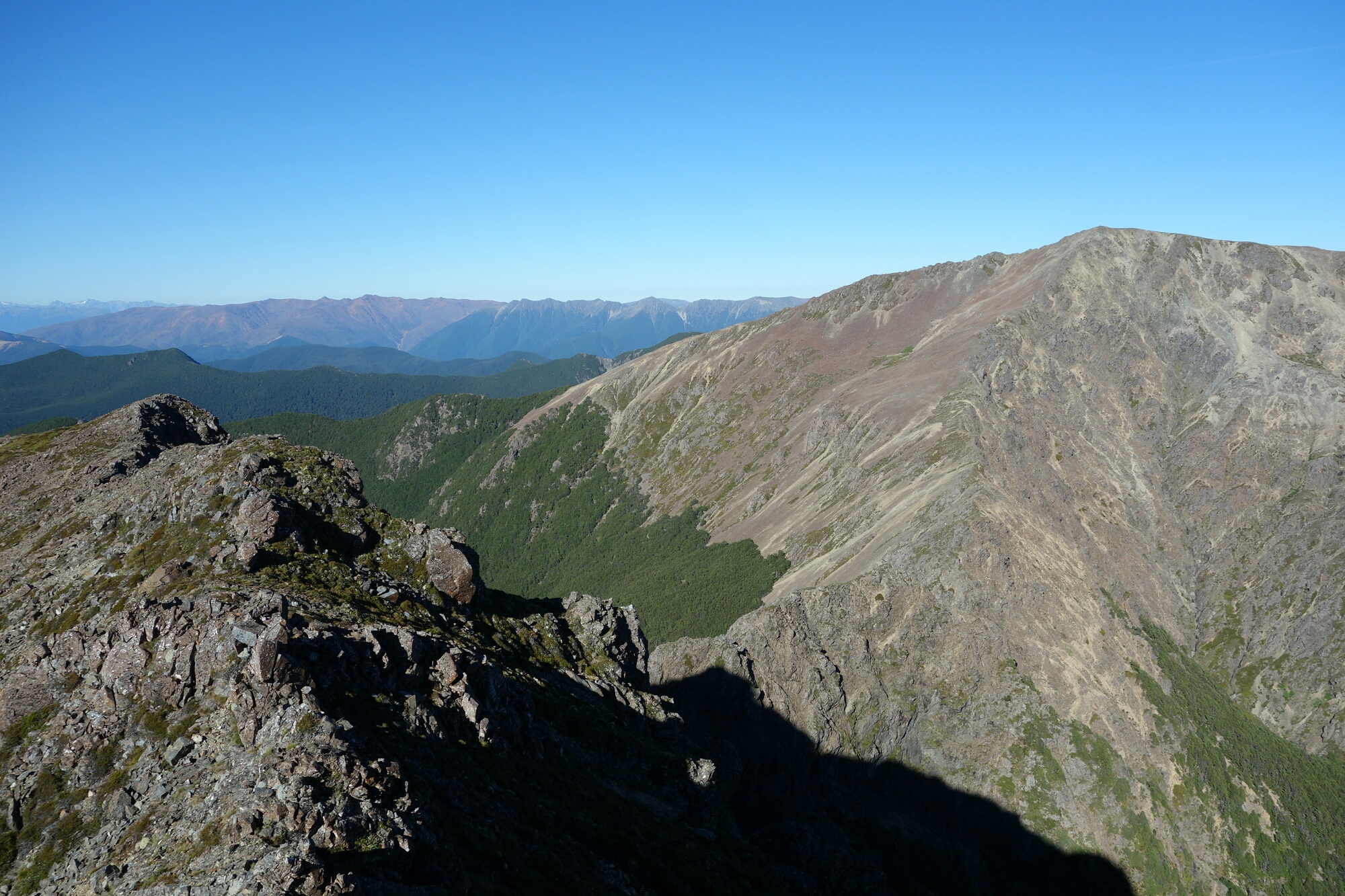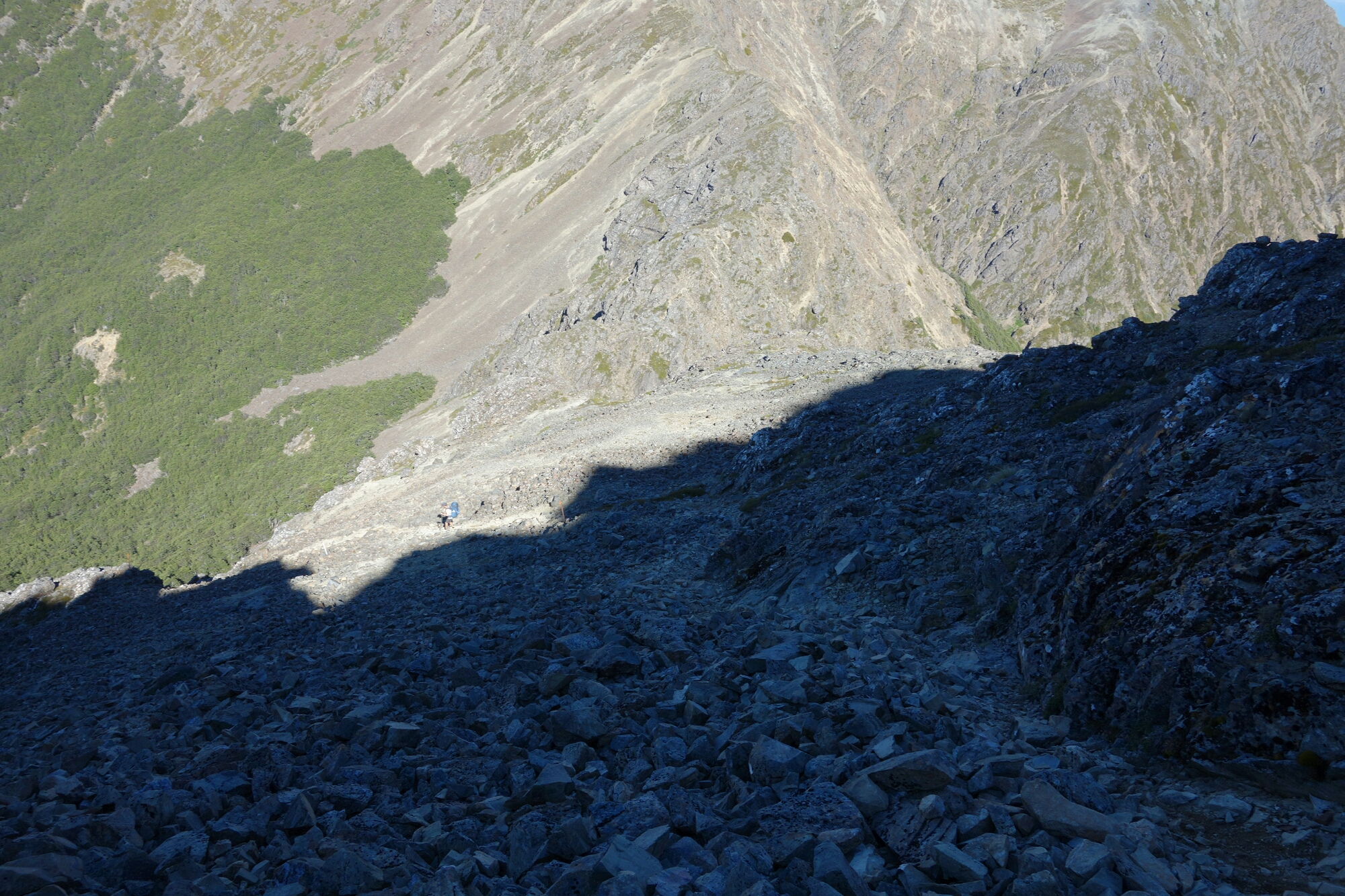 The track notes warn that the next 4km were difficult alpine track, and it is true that this track is not for novices. But there was only one 20m section that made me nervous and that was just before Little Rintoul where there is a not quite vertical cliff against your right shoulder and a cliff dropping off just to the left of the trail. Coming down from L. Rintoul on the other side is also challenging but not quite as scary. If there had been any wind or rain I would not have walked this trail. But the weather as perfect.