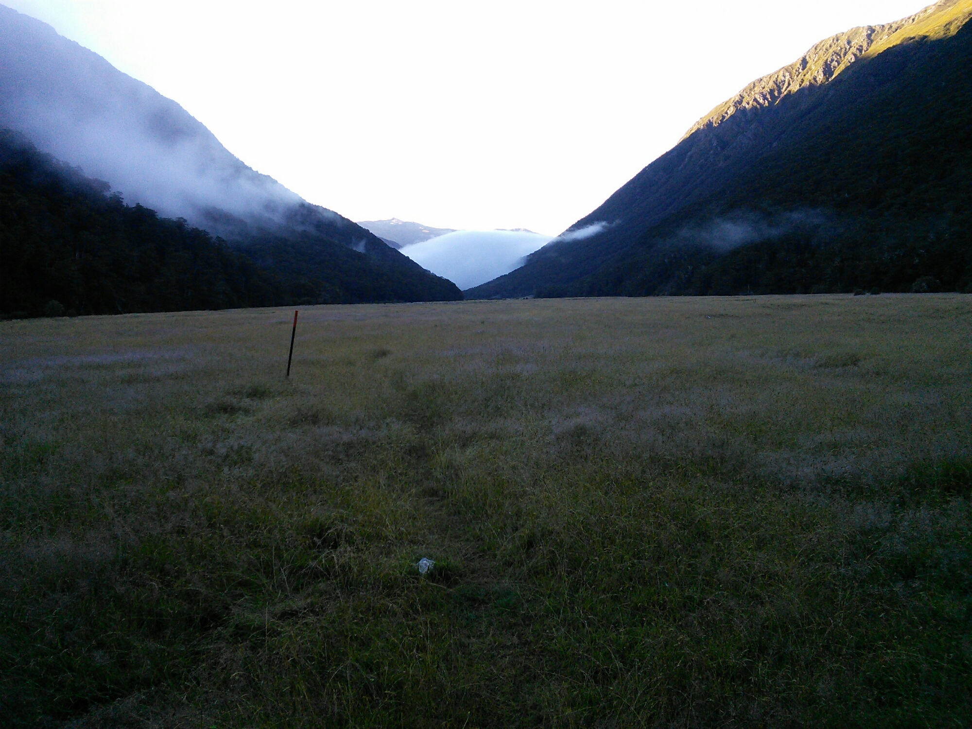 It was quick easy walking all day through grass fields and on 4wd tracks. With great views of the mountains and following rivers all day. The afternoon warmed up and dried out the grass and my clothes.