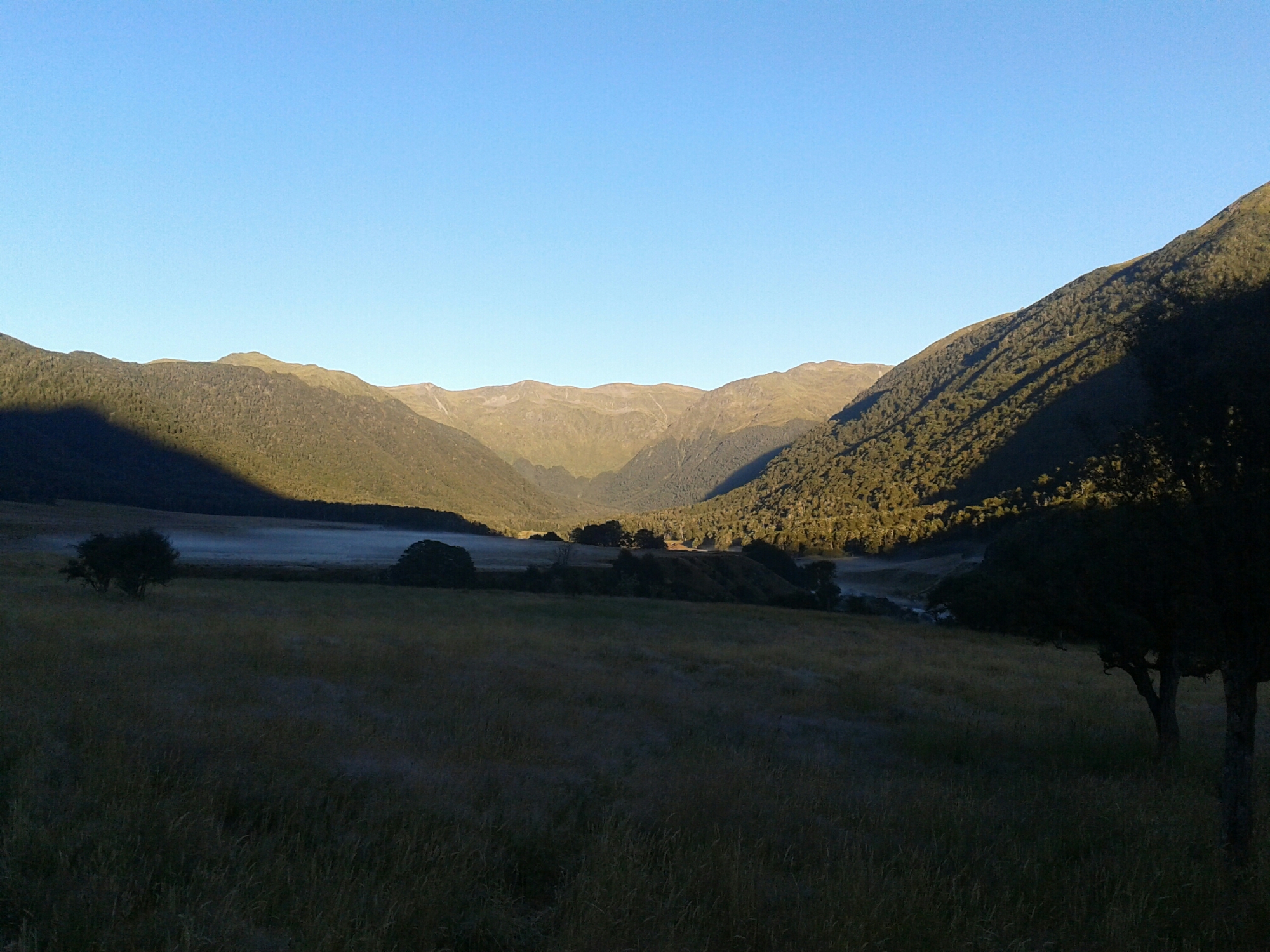Anne Hut is a big hut and with only 4 of us sharing it last night, so I ended up with a big sleeping flat to myself when I went to sleep. So I was surprised this morning when I woke up with someone sleeping on the other end of it. Nick from Brisbane came in at 11pm last night. He is doing the TA Trail in the South Island by paragliding from mountains wherever possible. He climbed and glided off of 5 hilltops yesterday. Pretty cool!