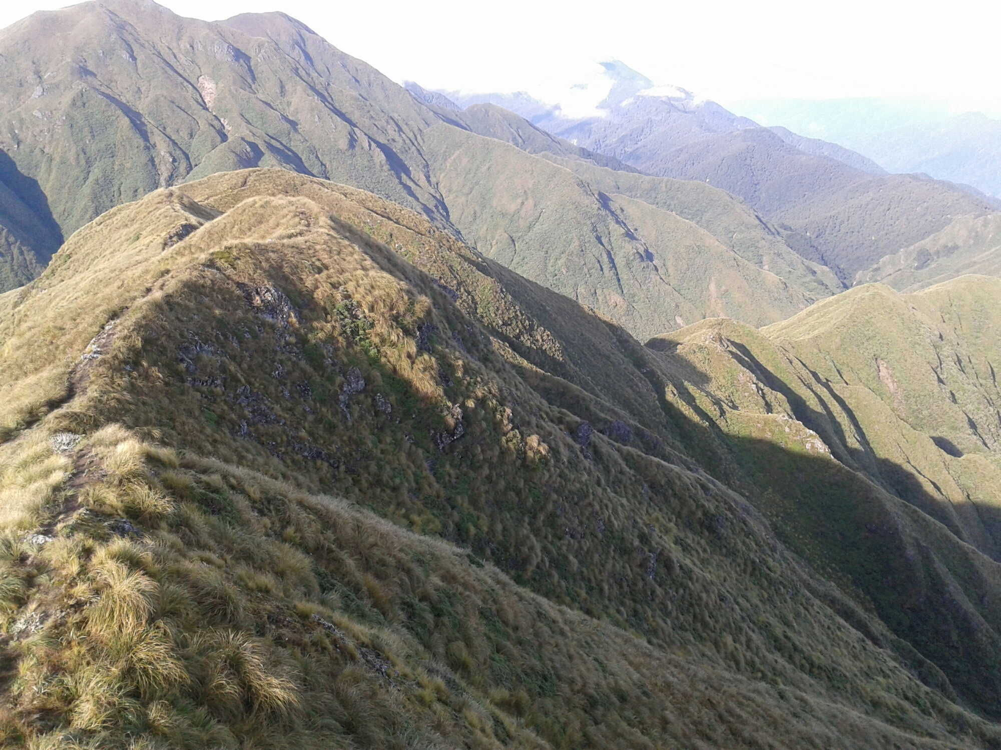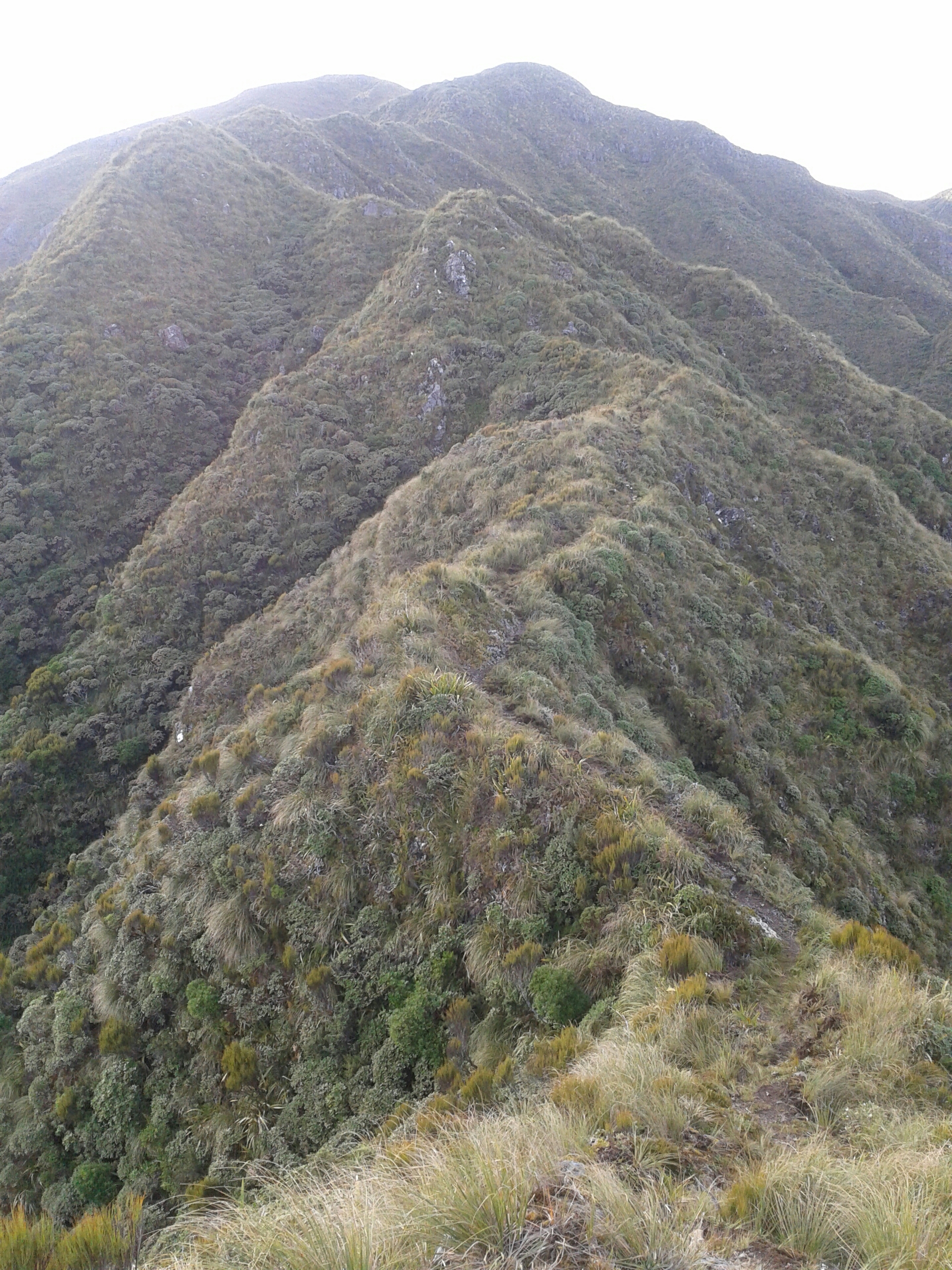 My thought this morning was that today would be easier than yesterday since I had already climbed to the ridge. On the map the ridge appeared almost smooth with a few climbs and descents, but the trail was continually alternating sharply up and sharply down on a micro scale. Meaning that there were a lot of ~20m dips that often required climbing with hands and feet to get down and up. There were also a few spots with shear drops next to narrow trails. A very challenging and exhausting hike.