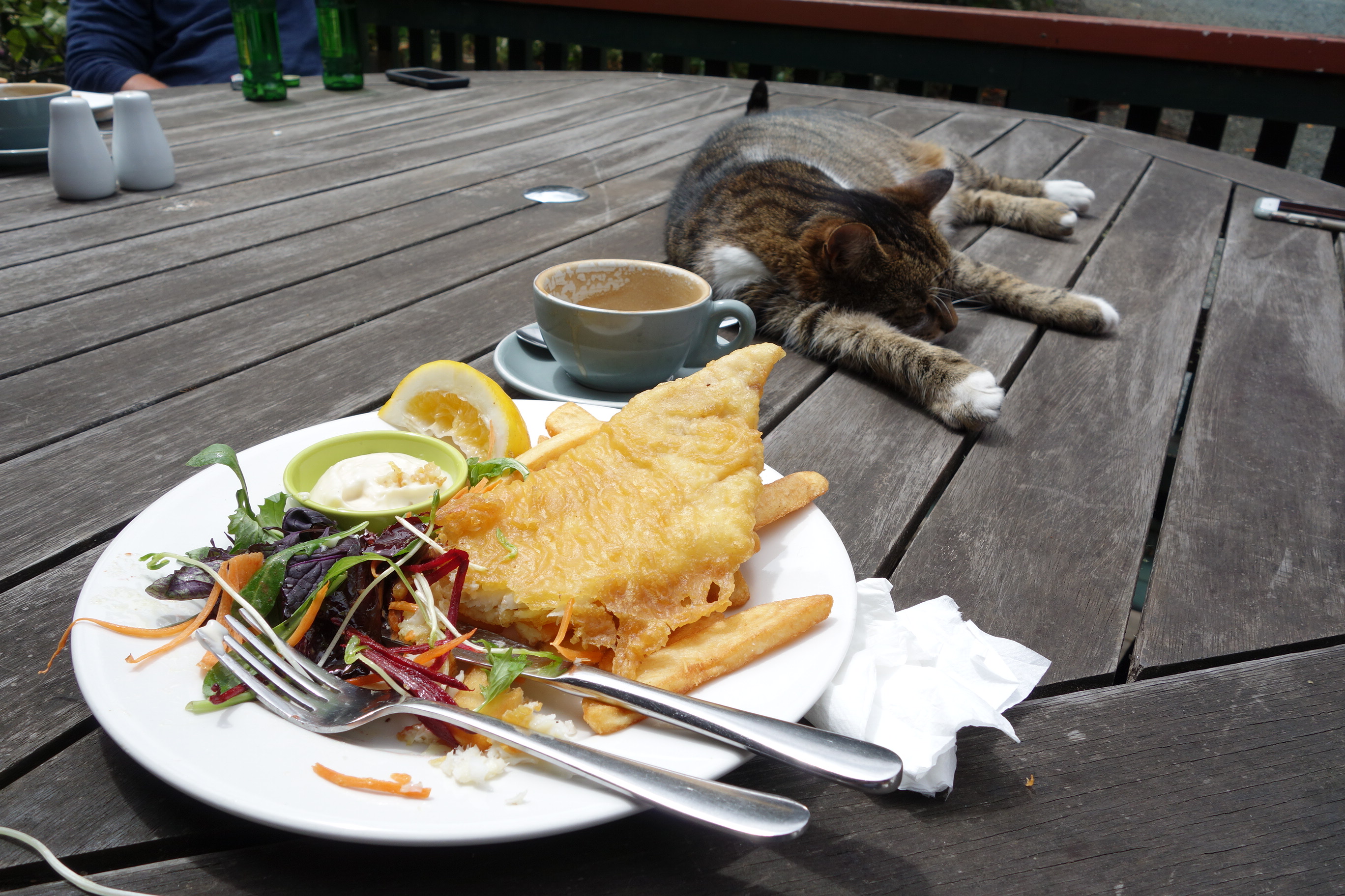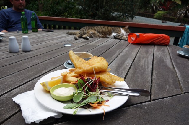 At the base of the Dome there is a cafe where the trail crosses the highway. We all stopped there for lunch and to rest. The cafe owners had lots of pets that were allowed the run of the place. Every time I looked up, the cat was a little closer to my plate of fish and chips. He was surprisingly well behaved so we let him hang out wherever he wanted to.
